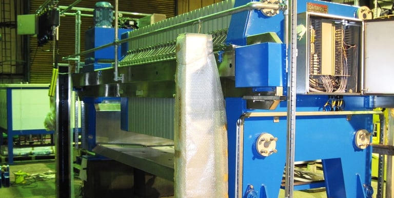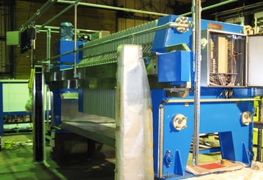 630 x 630mm square, recessed plate filter press used for dewatering metal hydroxide sludges from a plating shop effluent treatment plant.